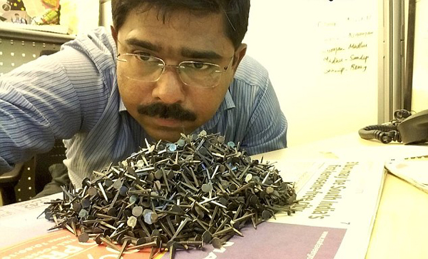据英国《每日邮报》1月15日报导,印度一名男人在曩昔5年中搜集了50多公斤钉子,据悉这些钉子是黑心轮胎修补公司成心撒在重要路段致使过往车辆爆胎的,以期不合法牟取暴利。